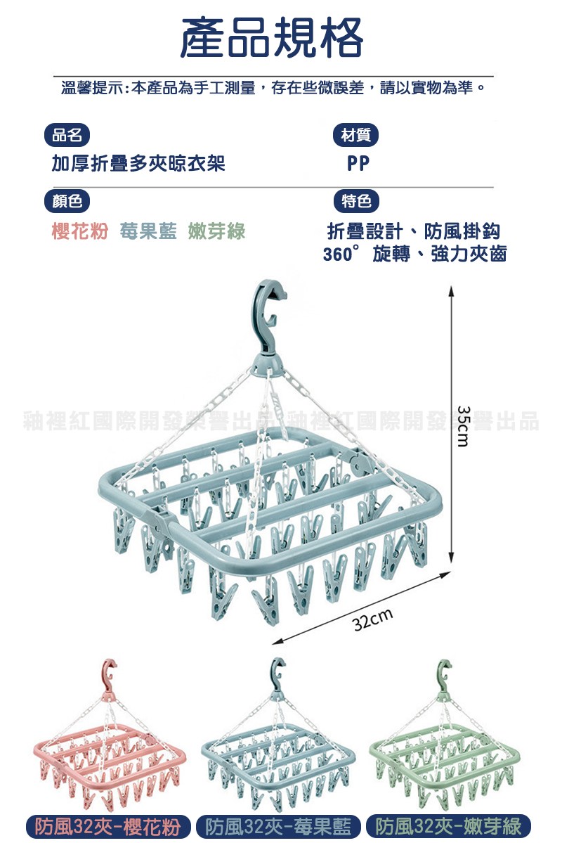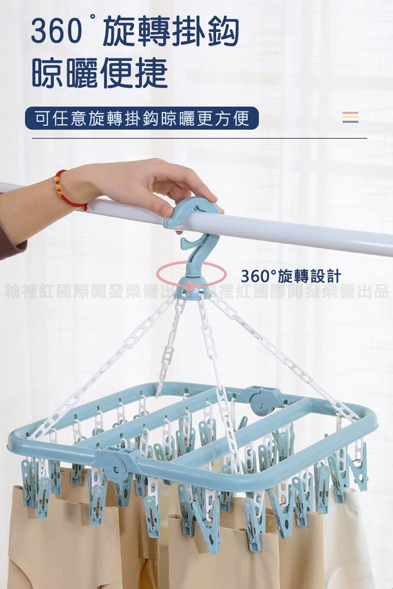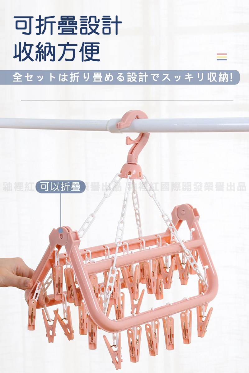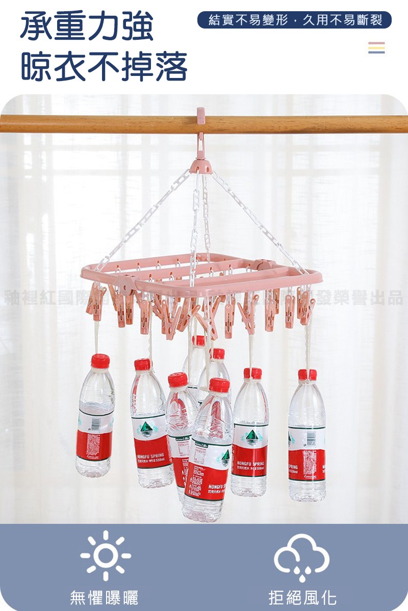 方形多夾晾衣架 32夾 可360°旋轉 防風掛勾設計 北歐粉 32cm x 32cm x 25.5cm