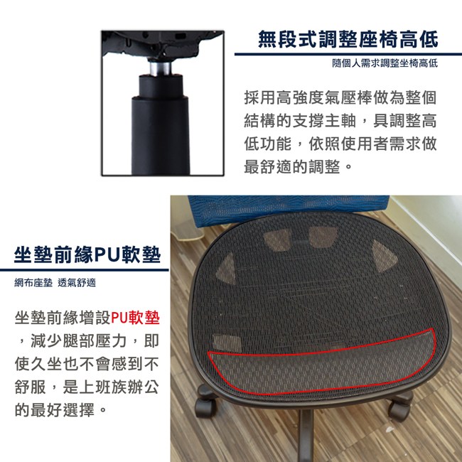 此款辦公椅椅背及座墊採透氣網布,堅固透氣不悶熱,前沿有PU墊坐起來柔軟舒適。氣壓棒可升降座椅,依您的身高及需求調整座墊高度。椅背表布,緹花設計,典雅花紋,精緻手感。此外更具備有彈力後仰的機制,後仰的鬆緊度亦可隨個人喜好來微調。