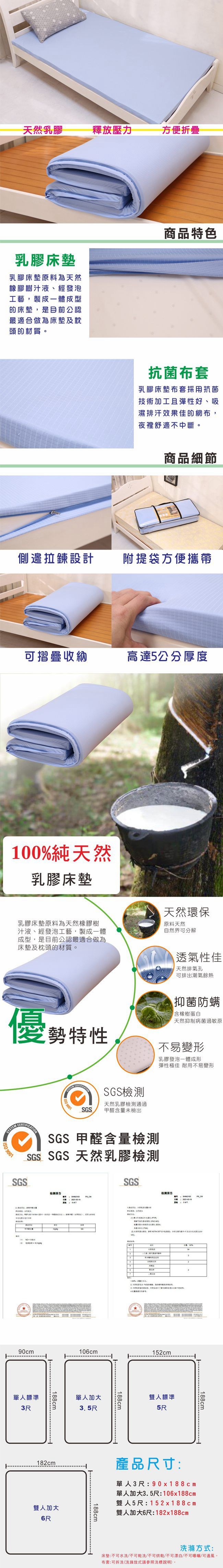 人一輩子大約花三分之一的時間在睡覺,如何睡得好、讓身體得到充分的休息絕對是很重要的一件事情,無奈許多人都花大錢買一大堆不合用床墊,或軟或硬,沒辦法換得一夜好眠。天然乳膠床墊,彈性極佳、耐用不易變形,觸感柔軟微Q彈,躺起來貼合身體,釋放一天的疲憊,提高睡眠品質。乳膠枕原料為天然橡膠樹汁液、經發泡工藝,Open cell乳膠透氣孔,透氣、防潮、清爽;橡樹蛋白,天然抑制病菌過敏原;SGS檢測,天然乳膠,未檢出甲醛含量。四折收合,收納方便,外宿及學生最適合,放置床上或直接鋪地使用都很便利。