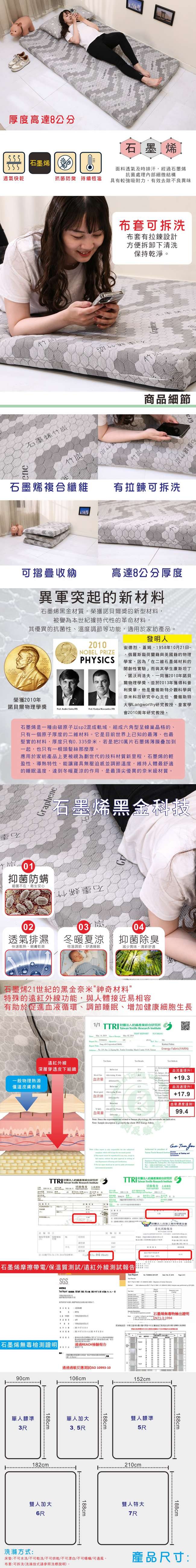 [表布]採用超導體石墨烯纖維,結合竹炭紗吸溼透氣、抗菌防臭。21世紀科命性黑金奈米科技-石墨烯,遠紅外線與人體接近易相容,有助於促進血液循環、調節睡眠、增加健康細胞生長。
