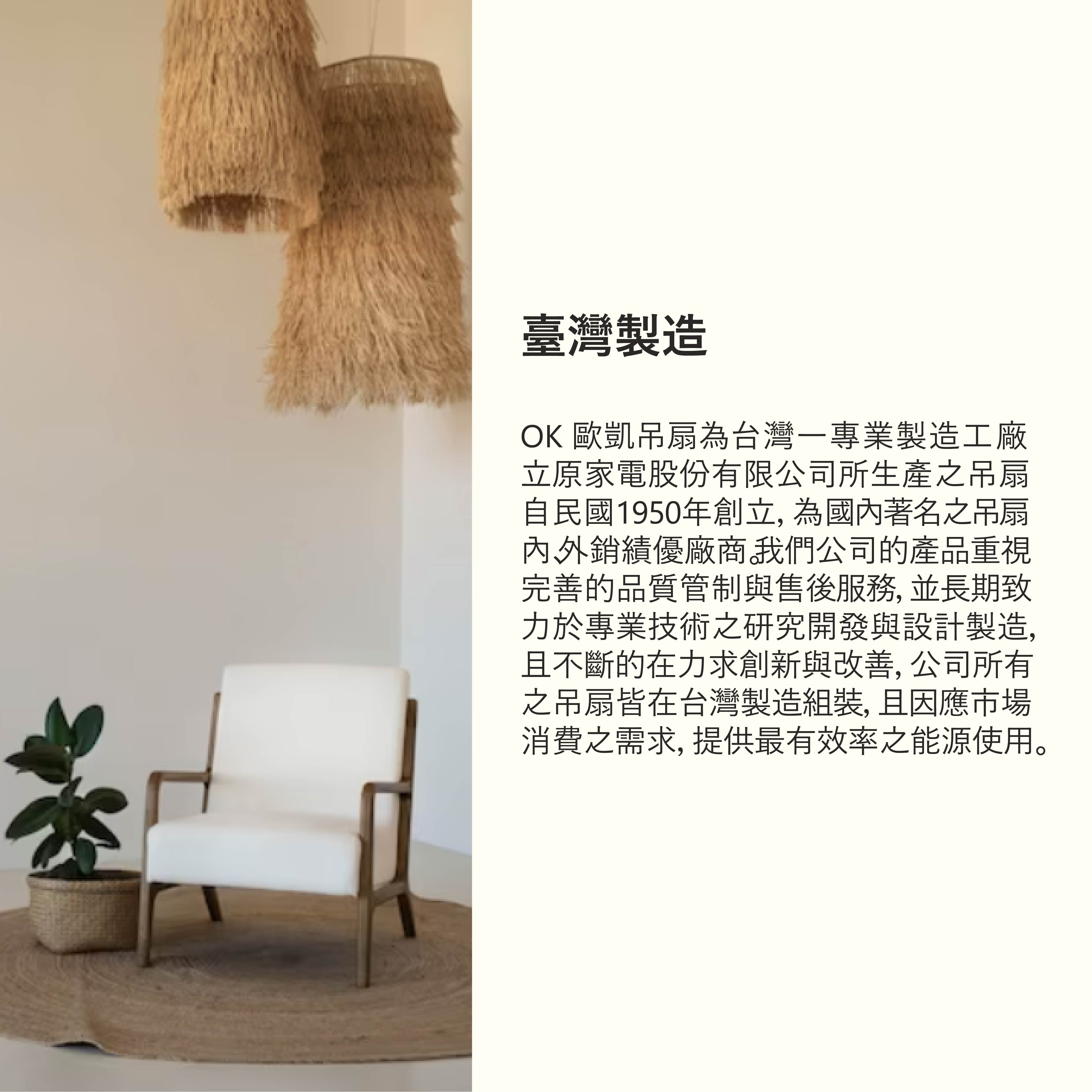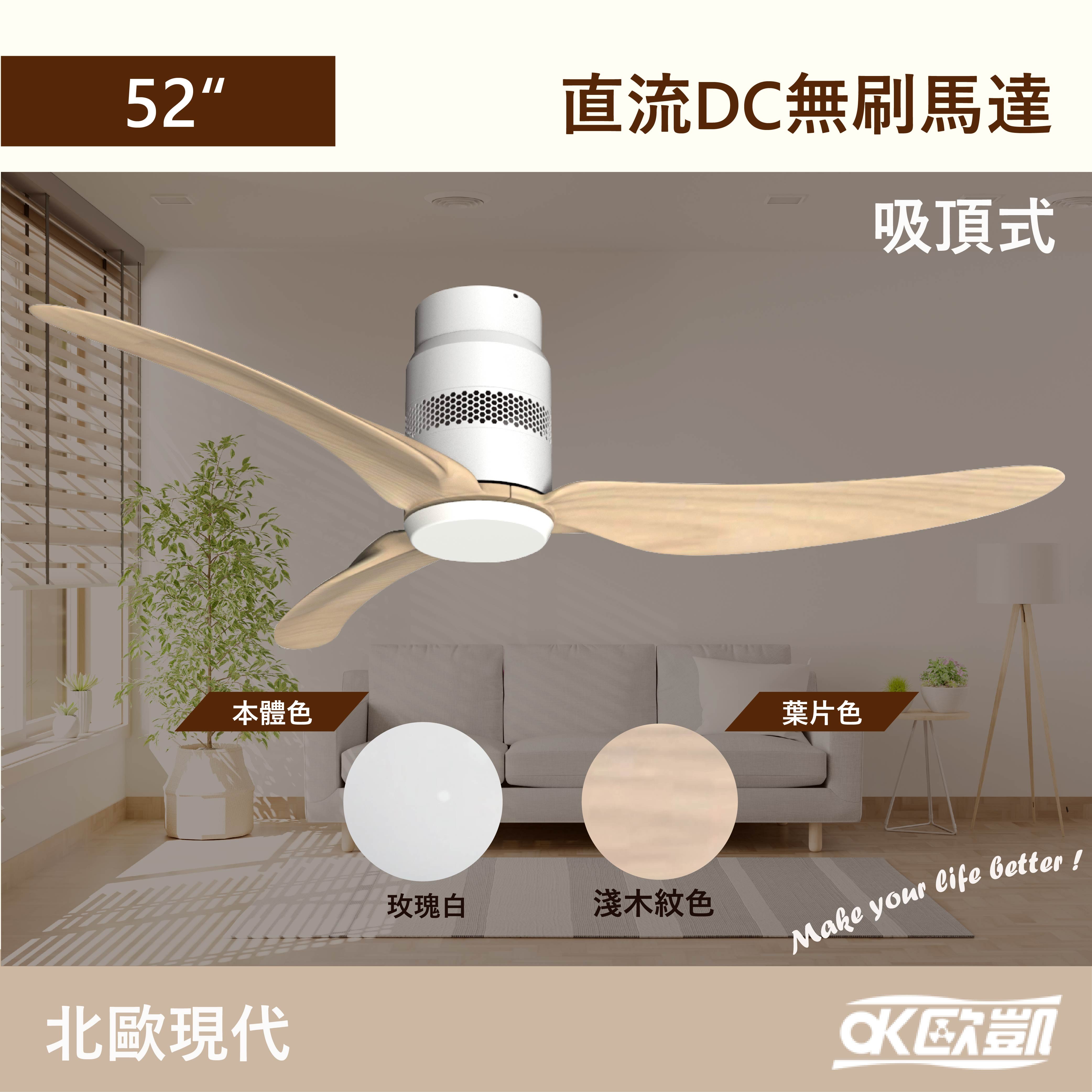 【OK歐凱】精緻藝術吊扇 直流DC無刷馬達 北歐現代 52吋 吸頂式(主體玫瑰白/葉片淺木紋色)贈東芝14W黃光6顆