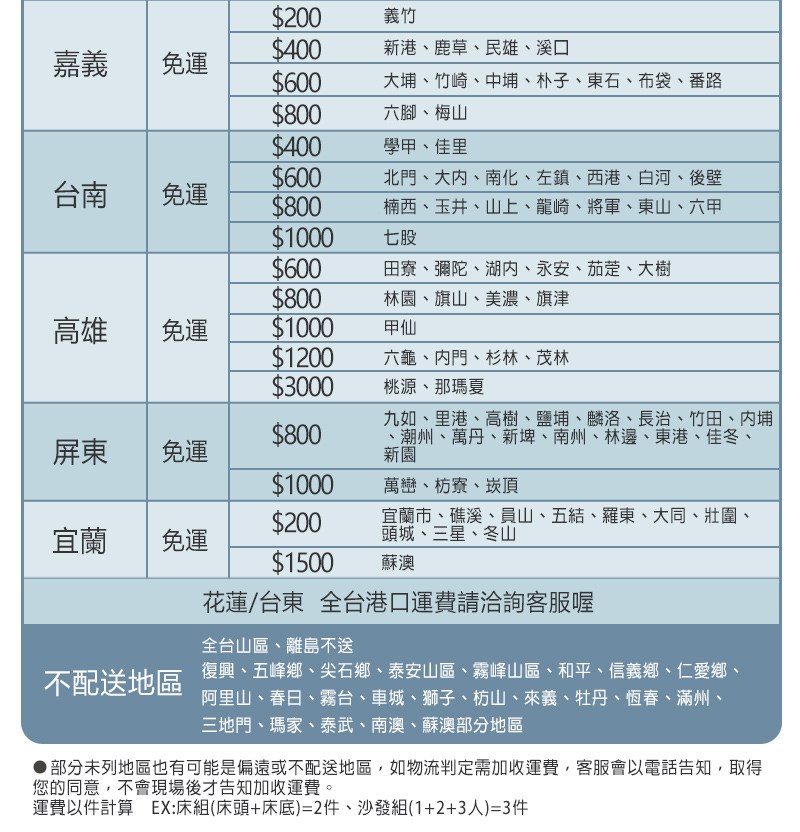 3.臺灣全省西半部主要城市,宜蘭、屏東、花蓮、台東、偏遠地區(台灣本島)需加收運費及離島恕無法服務。