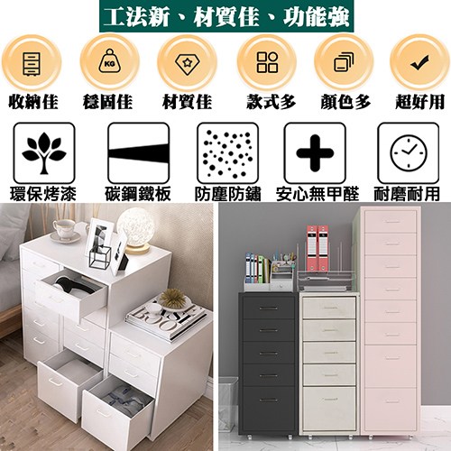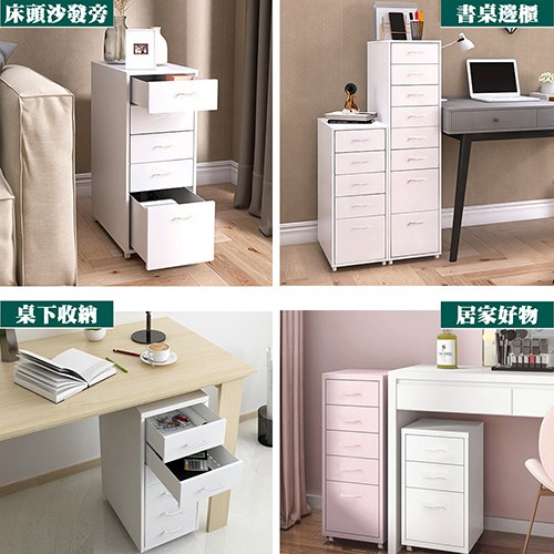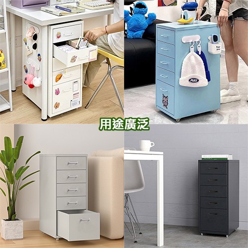 一大四小抽屜的設計,收納量大,能容納A4尺寸的物品,可依需求收納在大抽屜或小抽屜內,貼心的是抽屜前板有標籤匣設計並附贈紙卡,可以分門別類收納物品,一目瞭然方便辨識。底下附有四個活動滾輪,方便您隨心所欲的移動到需要使用的地方,文件櫃、收納櫃、工具櫃、床頭櫃、側邊櫃都很適合。