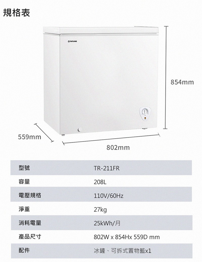 TATUNG大同208公升臥式冷凍櫃 TR-211FR~含拆箱定位+舊機回收