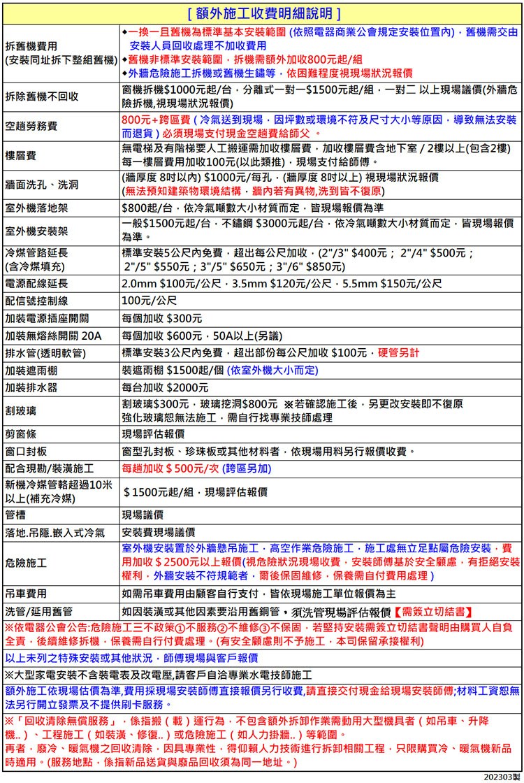 ◎請務必在購買之前,先丈量現場空間尺寸,及確認商品大小,外觀及裝機尺寸,頂樓/鐵皮屋/西曬建議再加大噸數,若師傅到府安裝發現因坪數或環境不符及尺寸大小等原因,導致無法安裝而退貨,則必須支付現金800元的空趟費給師父(單趟)偏遠區域另議(依原廠報價為主)。