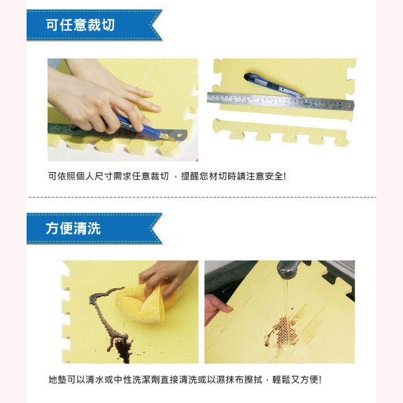 將地墊的拼裝齒互相接合即可, 可用大型美工刀裁切成適當大小,請小心割傷