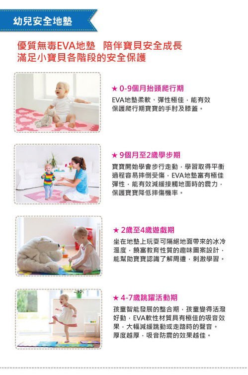 EVA地墊富有極佳的彈性,能有效減緩接觸地面時的震力,可保護孩童及年長者,降低跌倒、碰撞到堅硬地面時所造成的傷害。