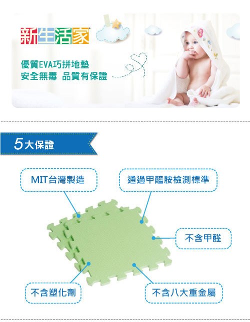 利用巧拼地墊打造更安全舒適的居家環境!我們提供的巧拼地墊通過甲醯胺、8項塑化劑及16種PAHs化合物檢測,並有各種花色、尺寸與厚度,也可依需求自行裁切,組裝方便,使用更有彈性。加強緩衝防撞保護,起居、遊戲空間皆適用,提供家人更安心的活動空間。