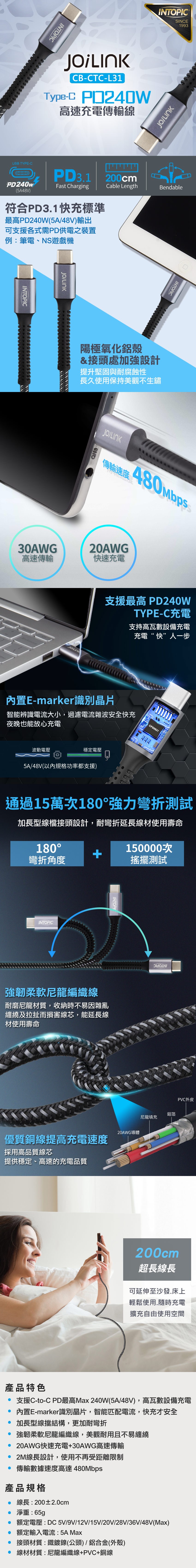 Integra 強韌系列USB-C to USB-C (240W/480Mbps) 充電/傳輸編織線 (1.2 m)
