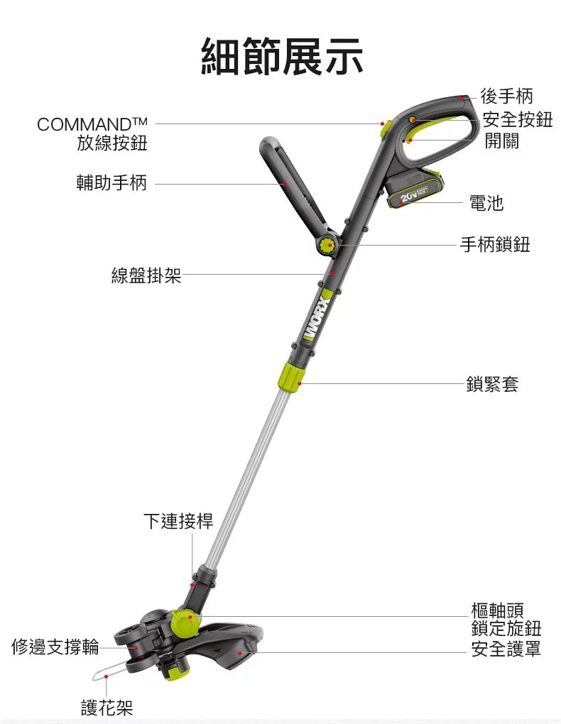 WORX 威克士 20V 無刷鋰電割草機30cm 空機 WD163.9