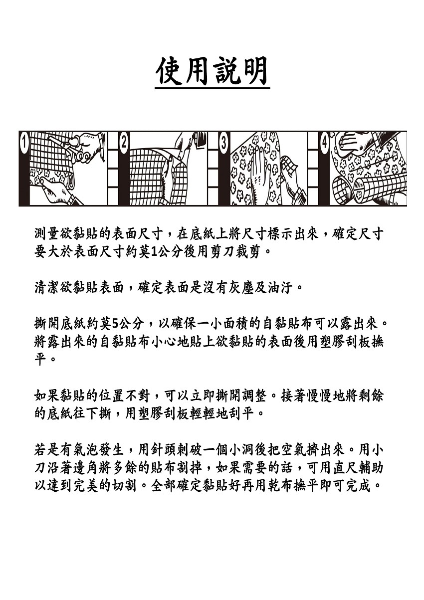 - 使用前先清潔黏貼處表面,裁剪尺寸,邊撕除裡紙邊黏貼