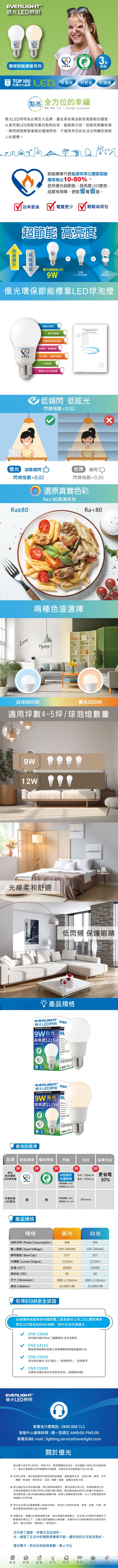 EVERLIGHT 億光 12W環保節能標章球泡燈-黃光 自然光 白光 8入(EL01/EL02/EL03)