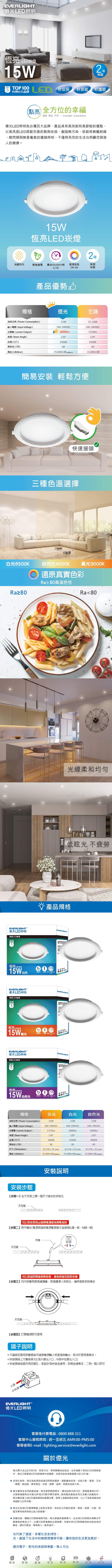 EVERLIGHT 億光 15W LED崁燈 15cm-黃光3000K 自然光4000K 白光6500K 3入(EK07/EK08/EK09)