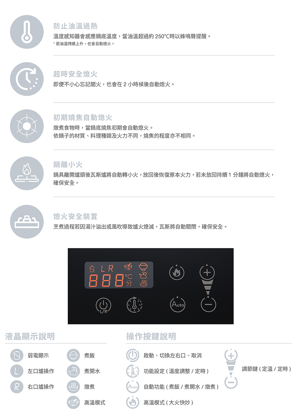 - ※小爐口無以上功能,僅搭載熄火安全裝置