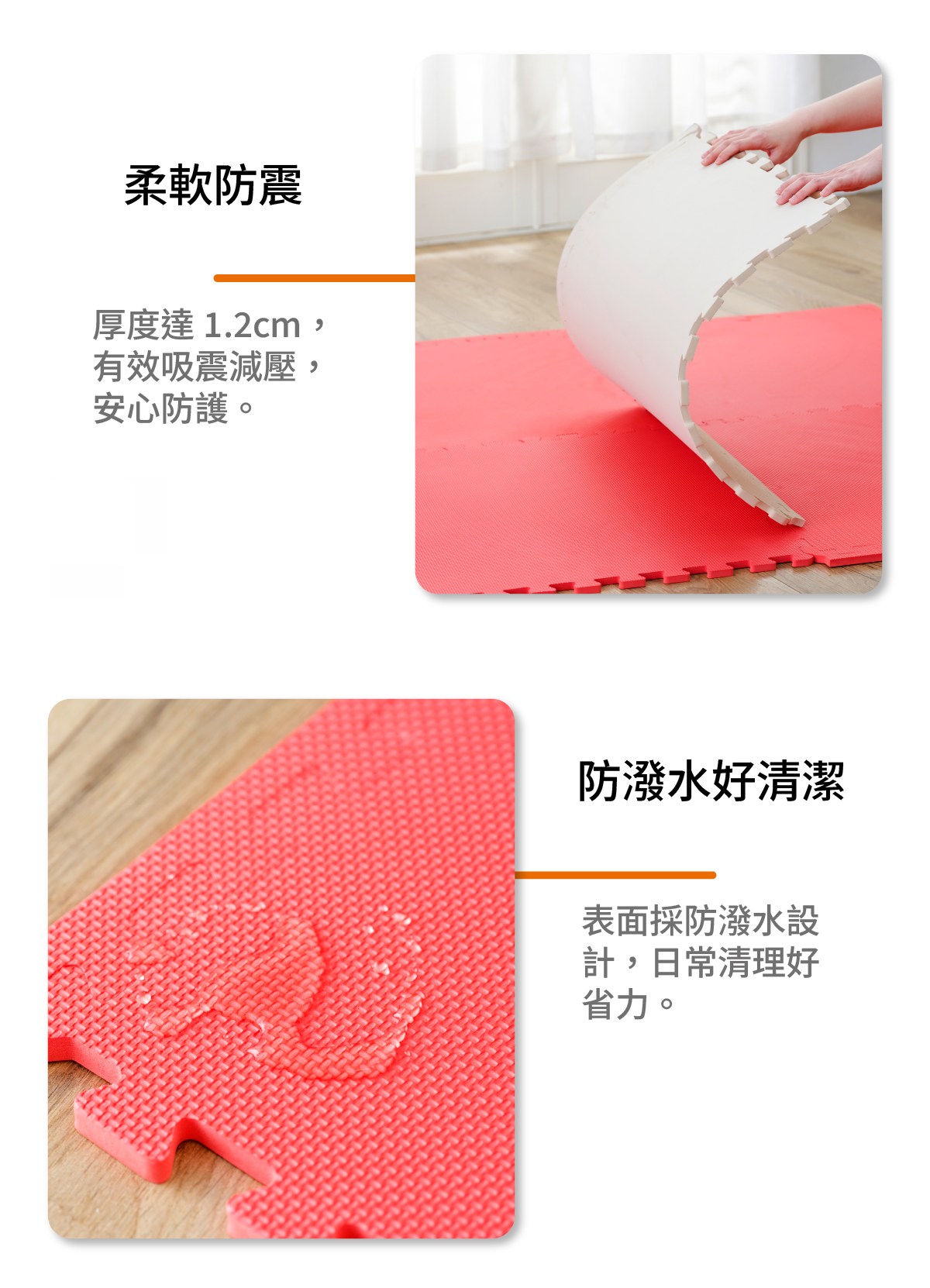 利用巧拼地墊打造更安全舒適的居家環境!我們提供的巧拼地墊通過甲醯胺、8項塑化劑及16種PAHs化合物檢測,並有各種花色、尺寸與厚度,也可依需求自行裁切,組裝方便,使用更有彈性。加強緩衝防撞保護,起居、遊戲空間皆適用,提供家人更安心的活動空間。