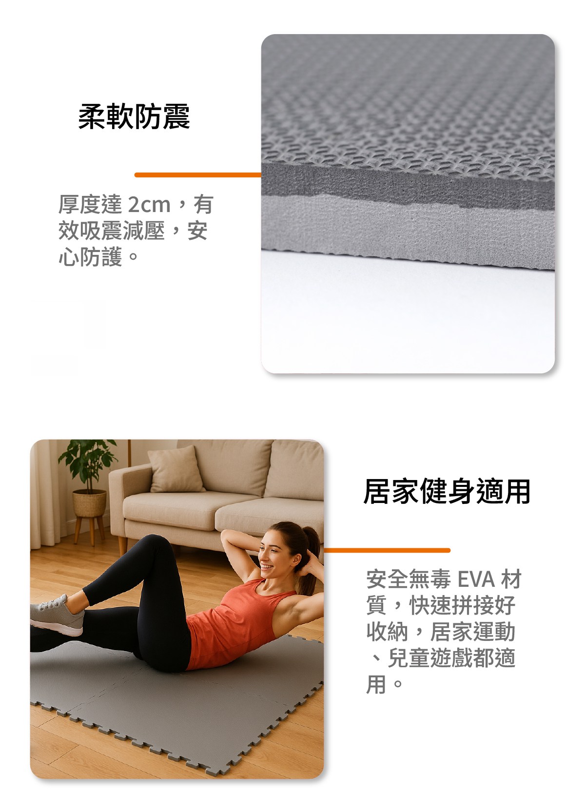 利用巧拼地墊打造更安全舒適的居家環境!我們提供的巧拼地墊通過甲醯胺、8項塑化劑及16種PAHs化合物檢測,並有各種花色、尺寸與厚度,也可依需求自行裁切,組裝方便,使用更有彈性。加強緩衝防撞保護,起居、遊戲空間皆適用,提供家人更安心的活動空間。