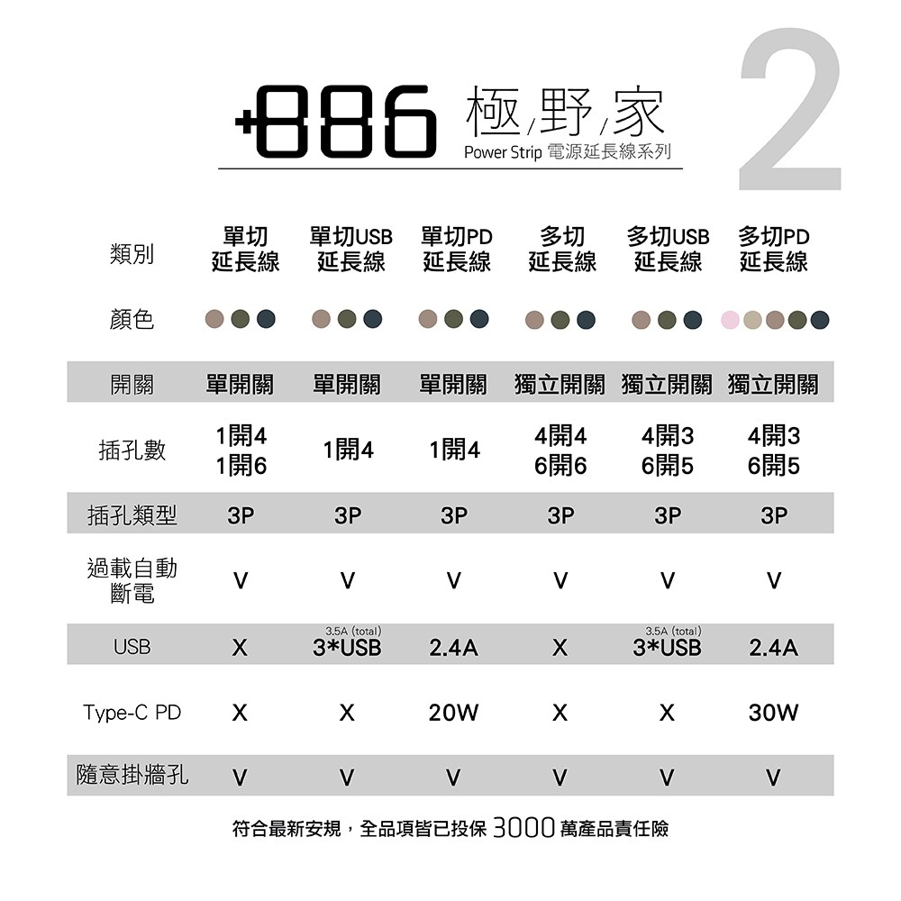 +886 |極野家 4開3插 USB+Type C PD快充延長線 1.8m 三色 - 軍綠