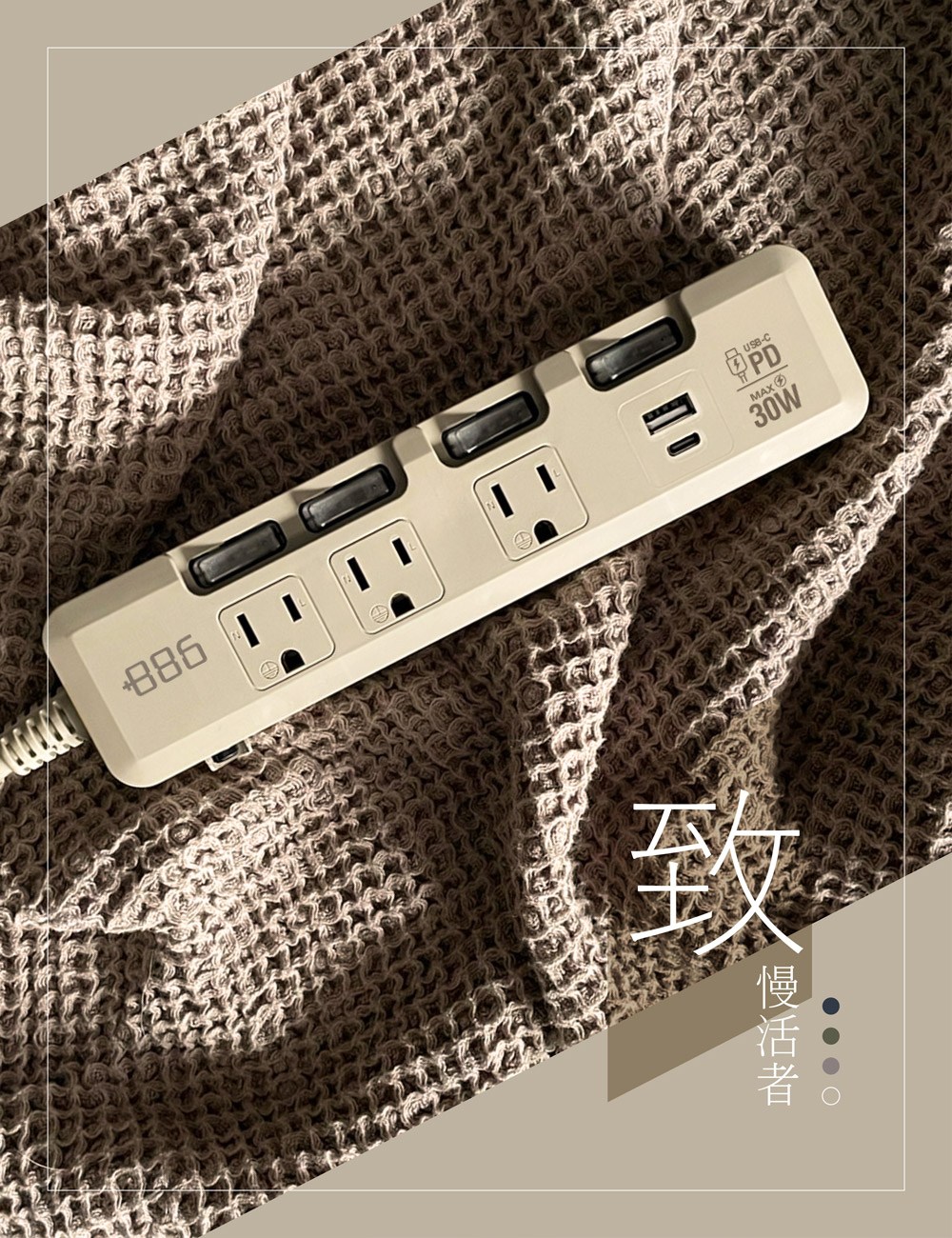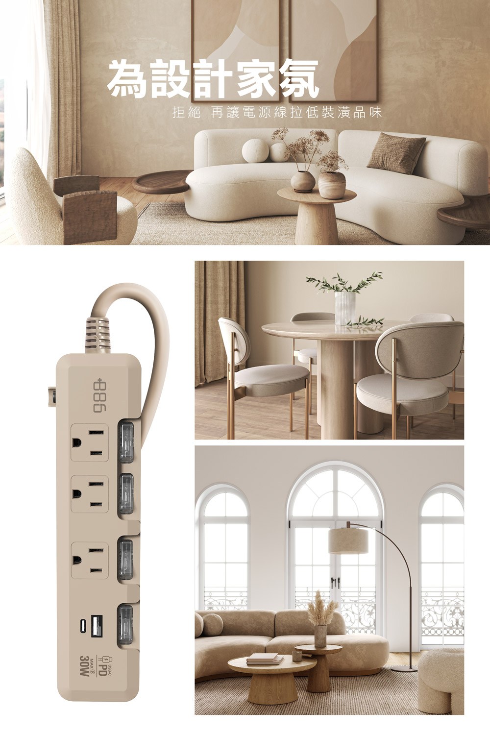 +886 極野家 4開3插USB+Type C PD 30W快充延長線 奶茶