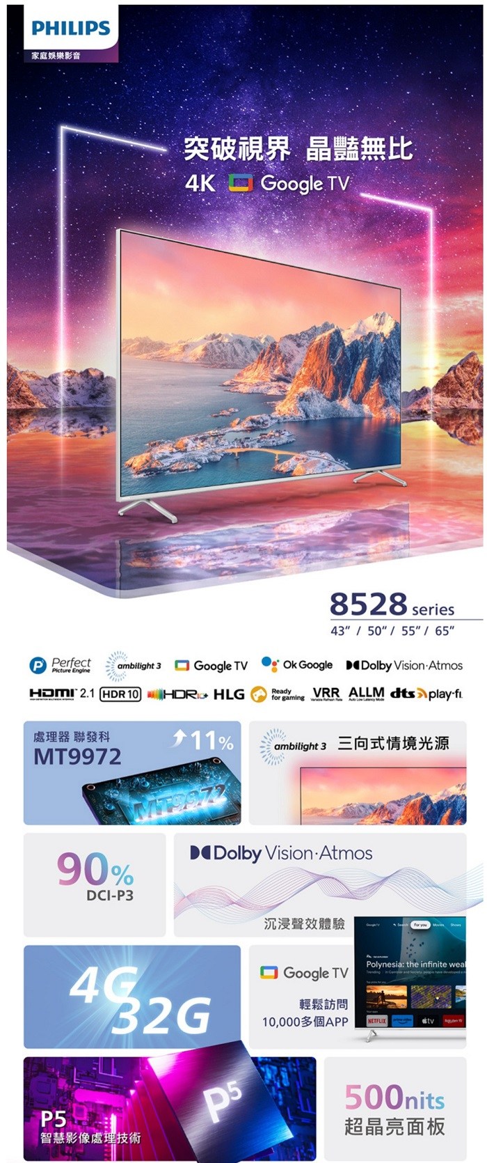 Philips 飛利浦 65吋4K 超晶亮 Google TV智慧聯網液晶顯示器 65PUH8528 含運不裝跨區另計