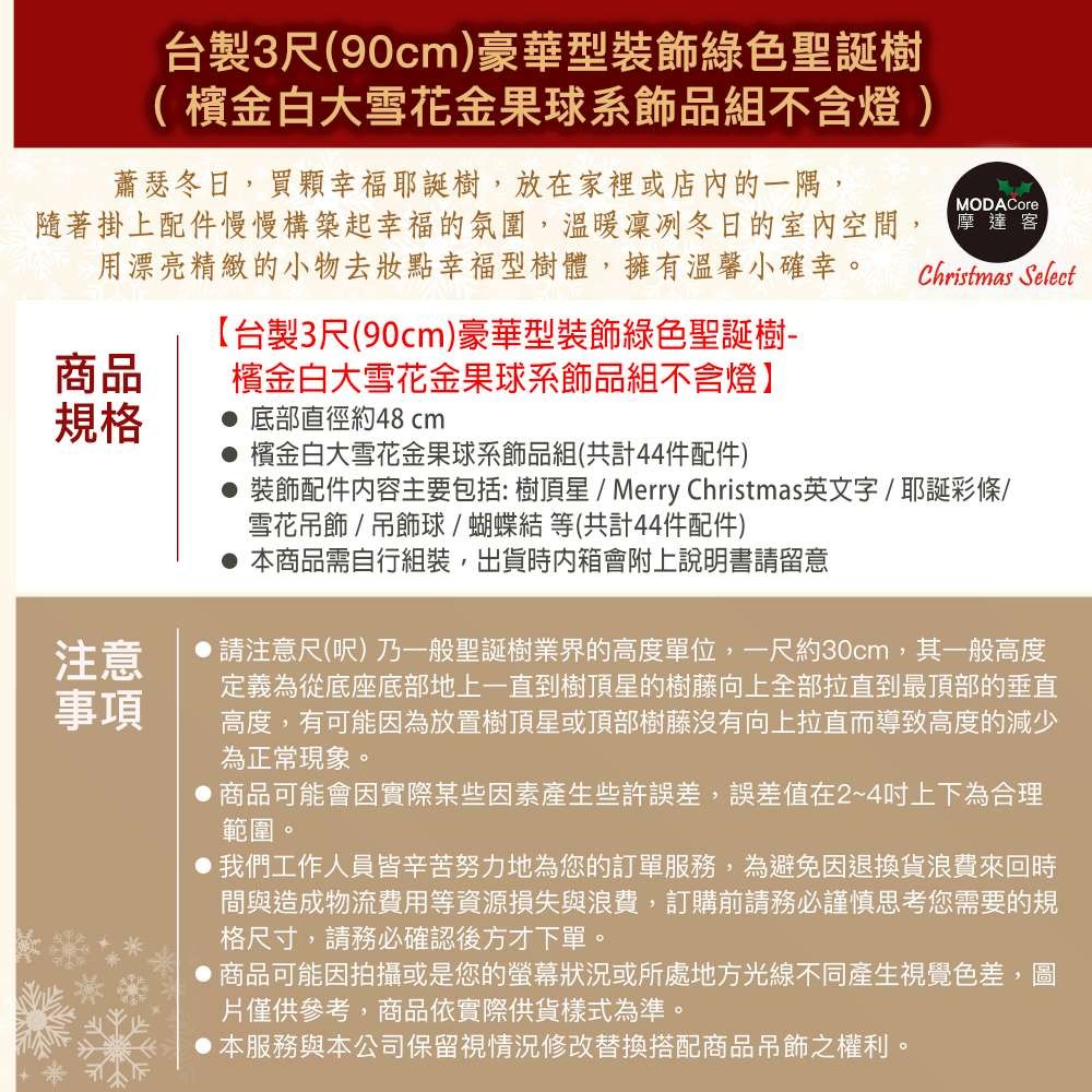 【摩達客】台灣製3尺/3呎(90cm)豪華型裝飾綠色聖誕樹/檳金白大雪花金果球系全套飾品組不含燈/本島免運費