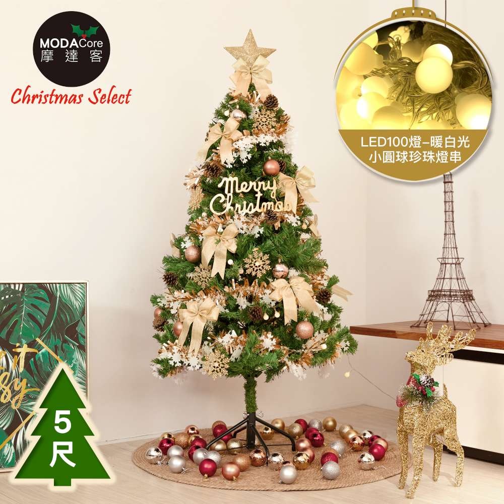 摩達客台灣製8尺(240cm)豪華型裝飾綠色聖誕樹/全套飾品組(兩色可選)+100燈LED小圓球珍珠燈串(暖白光/USB接頭)*2串/本島免運費