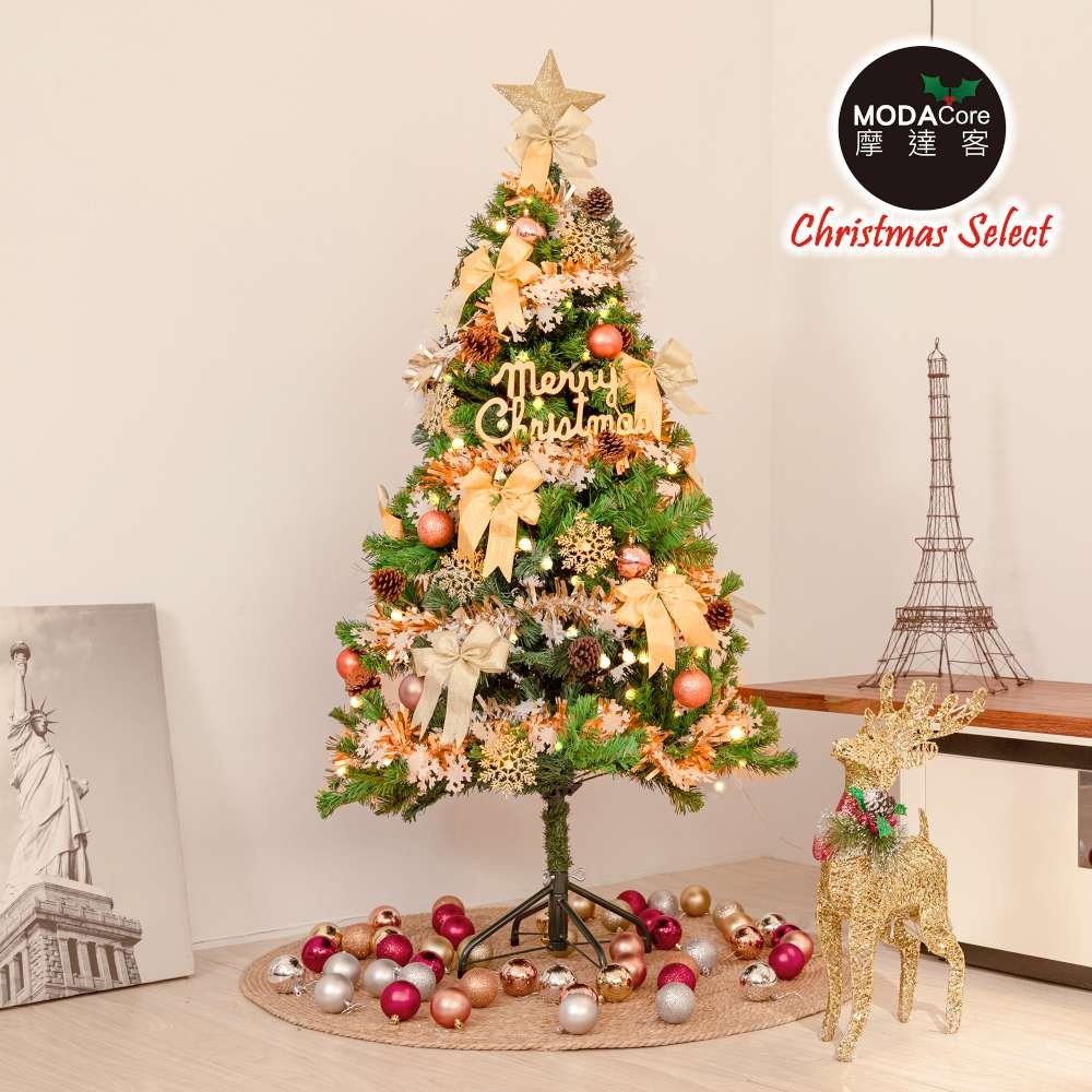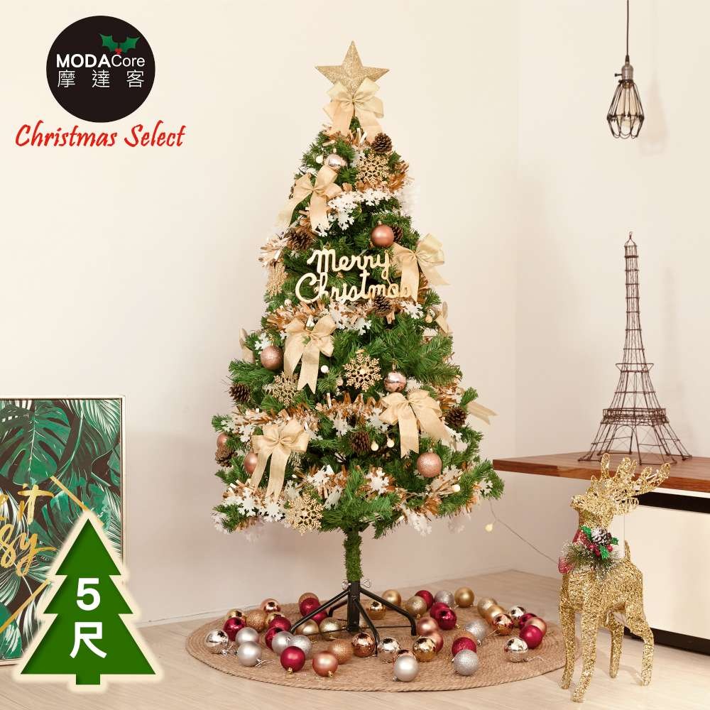 摩達客台灣製5尺/5呎(150cm)豪華型裝飾綠色聖誕樹/檳金白大雪花金果球系全套飾品組不含燈/本島免運費