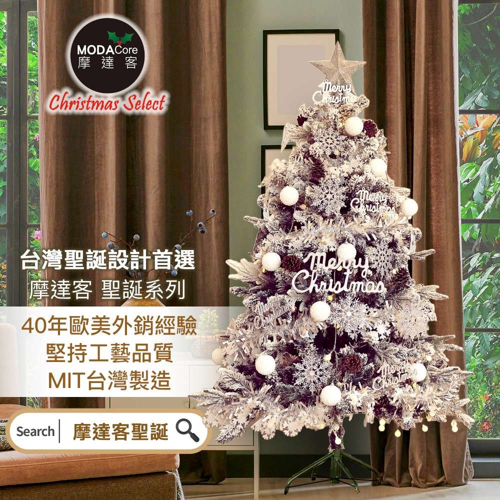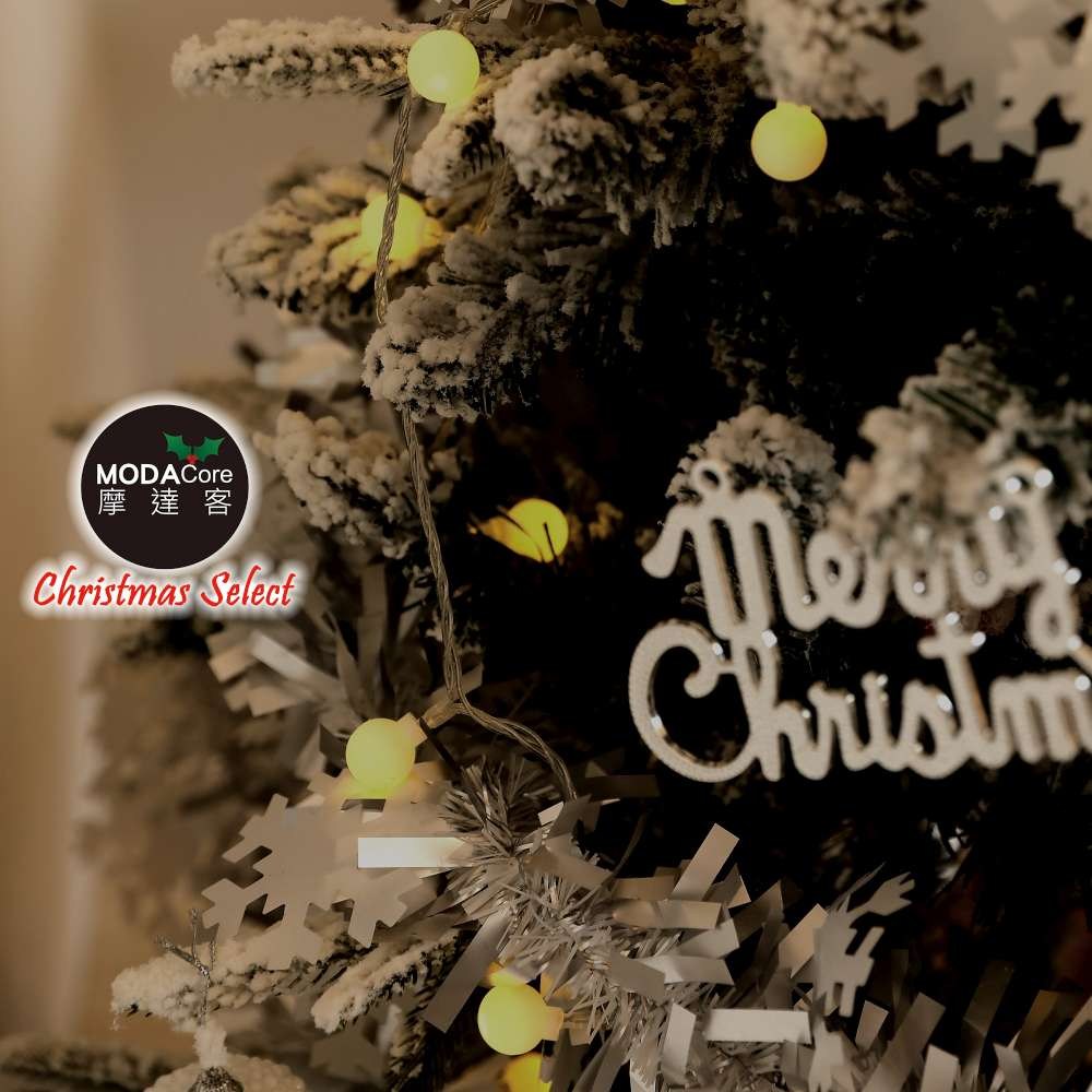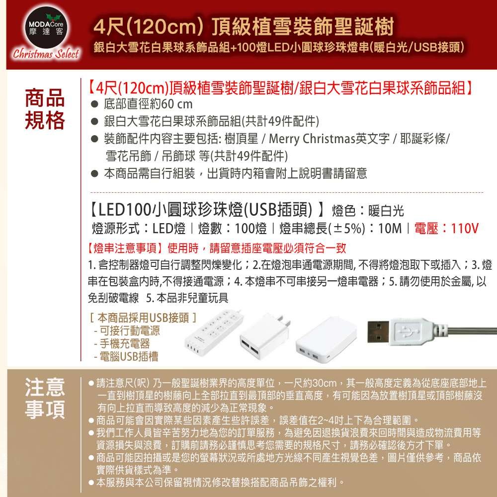 摩達客4尺/4呎(120cm)頂級植雪裝飾聖誕樹/銀白大雪花白果球系全套飾品組+100燈LED小圓球珍珠燈串(暖白光/USB接頭) *1 本島免運費