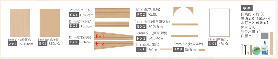 組裝簡易好上手。內附彈珠、白膠、砂紙、組裝說明書 ,請自行準備鐵鎚、螺絲起子、鉛筆、直尺,按照說明書步驟即可完成。
