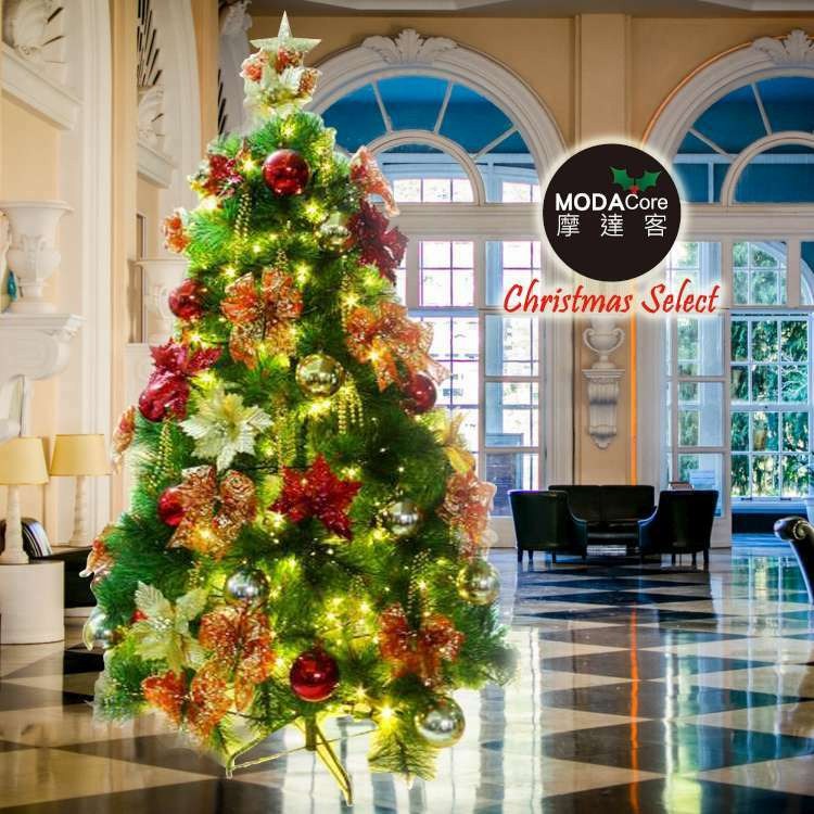 摩達客 10尺300cm特級綠松針葉聖誕樹+聖誕花蝴蝶結配件+100燈LED燈暖白光6串