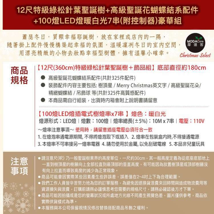 摩達客耶誕-台灣製7尺(210cm)特級綠松針葉聖誕樹+高級聖誕花蝴蝶結系配件+100燈LED燈暖白光2串(附控制器)豪華組 飯店級(本島免運費)