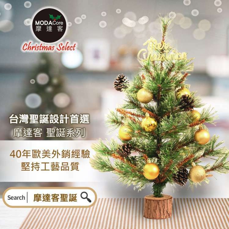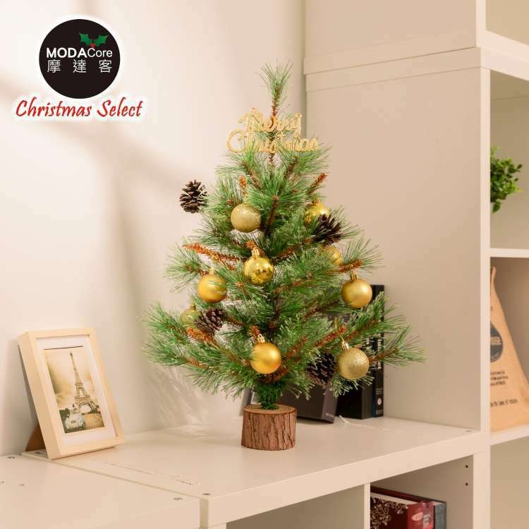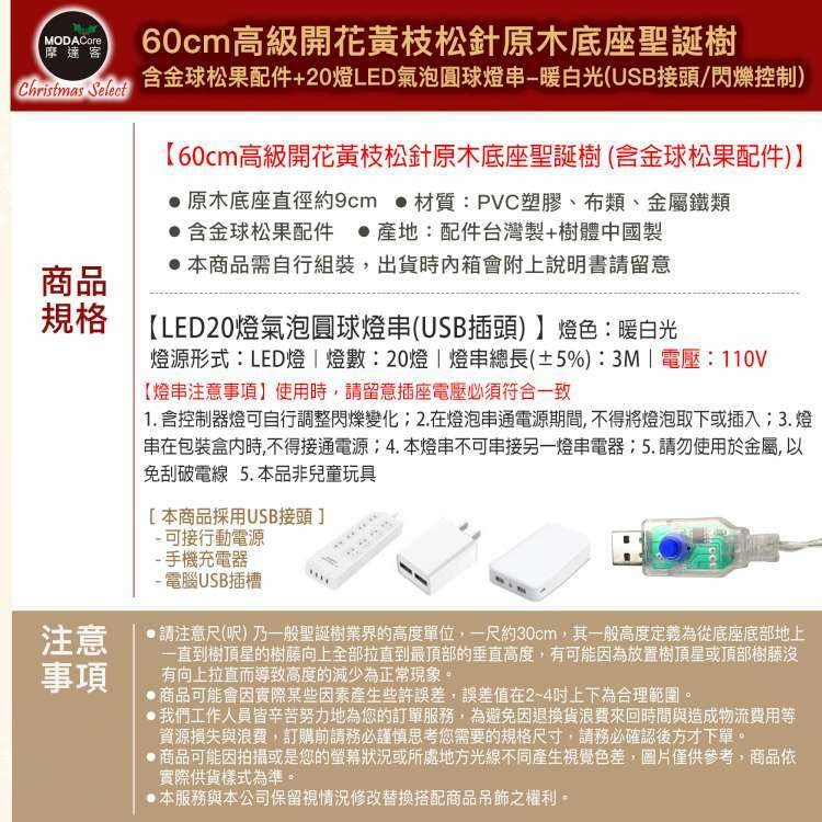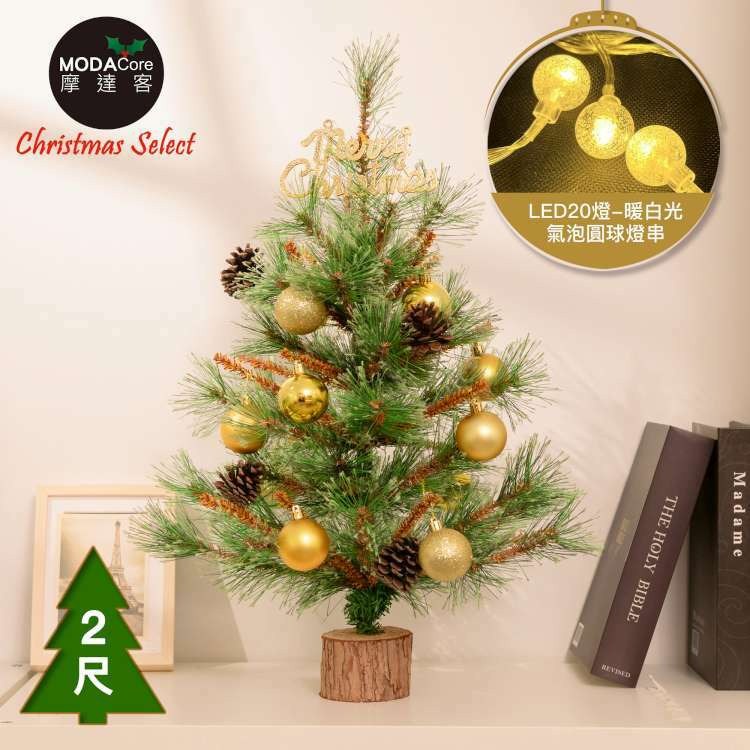 60cm高級開花黃枝松針原木底座聖誕樹含金球松果配件+20燈LED氣泡圓球暖白燈 本島免運