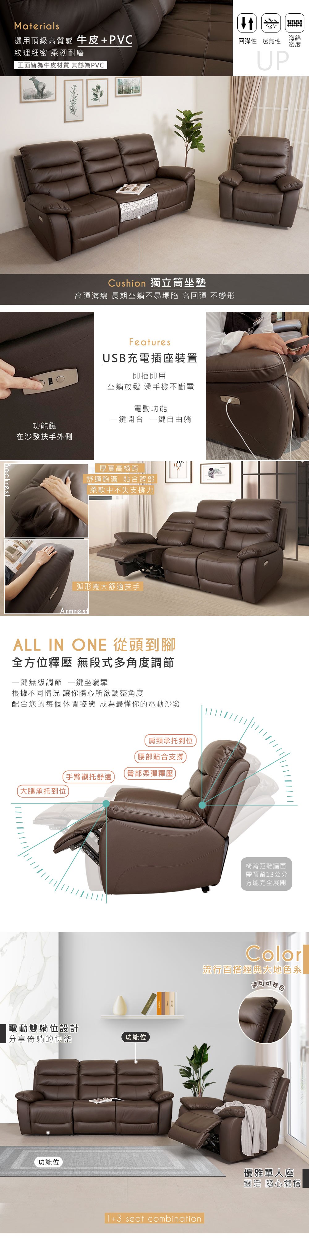 hoi!芝華仕頭等艙 防潑水貓抓絨 三人零靠牆電動沙發組附USB 30375 羽絨淺灰