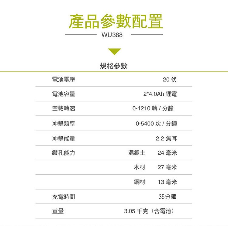 WORX 威克士 WU388 20V 三用鋰電無刷電鎚 24mm 錘鑽 鑽瓷磚不裂 免出力 德國紅點設計大獎 無刷電鎚