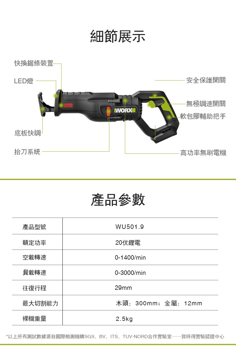 WORX 威克士20V 鋰電無刷軍刀鋸 空機 WU501-9