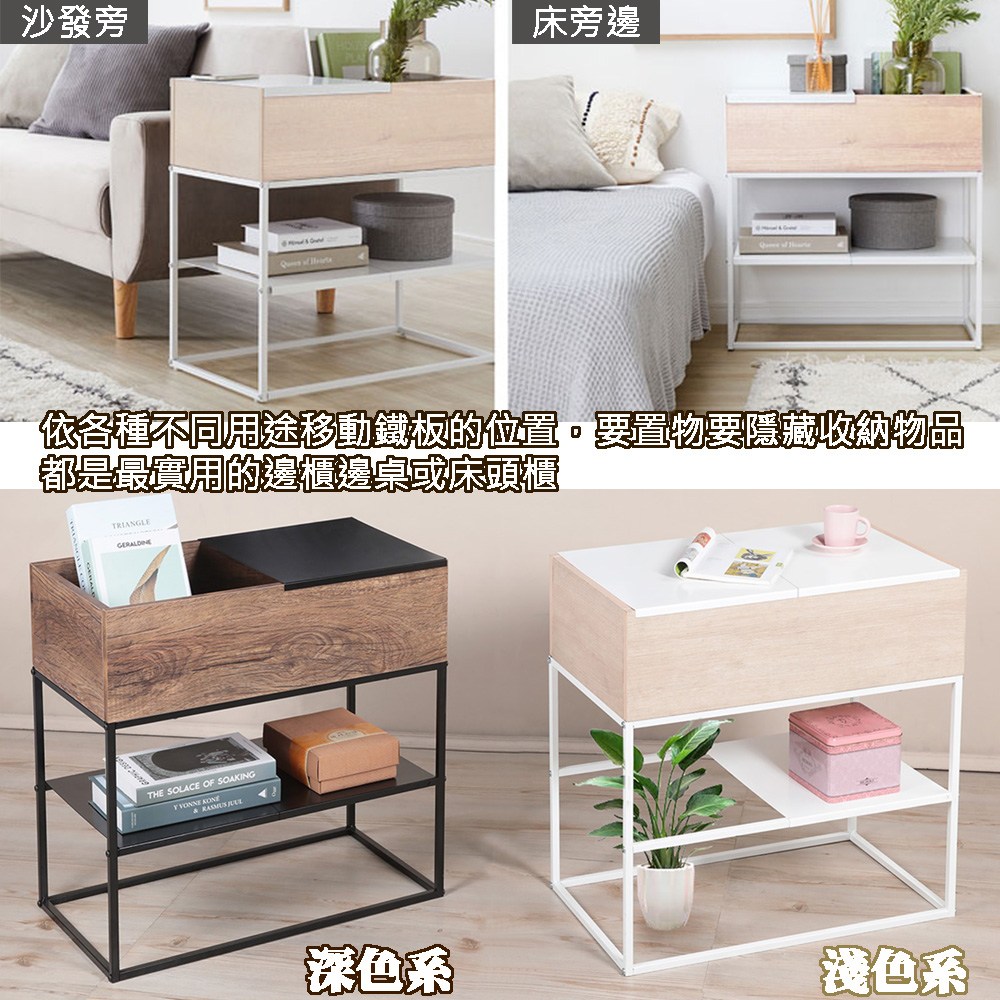 結構穩固不搖晃,在沙發邊、床邊、書桌邊、餐桌邊···三片活動式的鋼鐵板材質桌板,可依使用者的需求隨意變換位置,要當桌板、要當置物層板、要當蓋子都隨心所欲,底部簡單的框架式設計讓物品可放置於地面,無損收納空間。