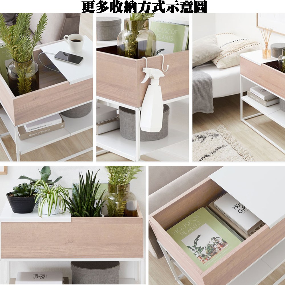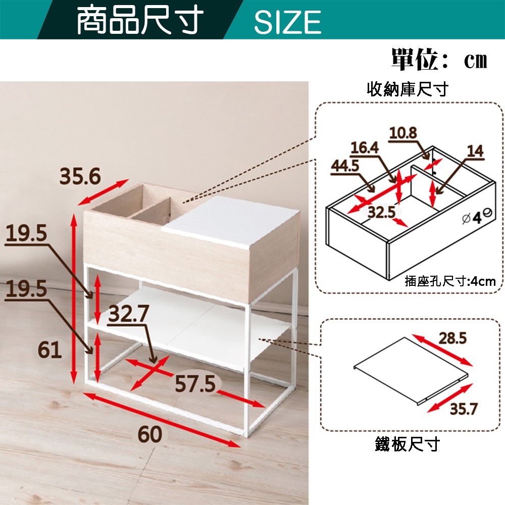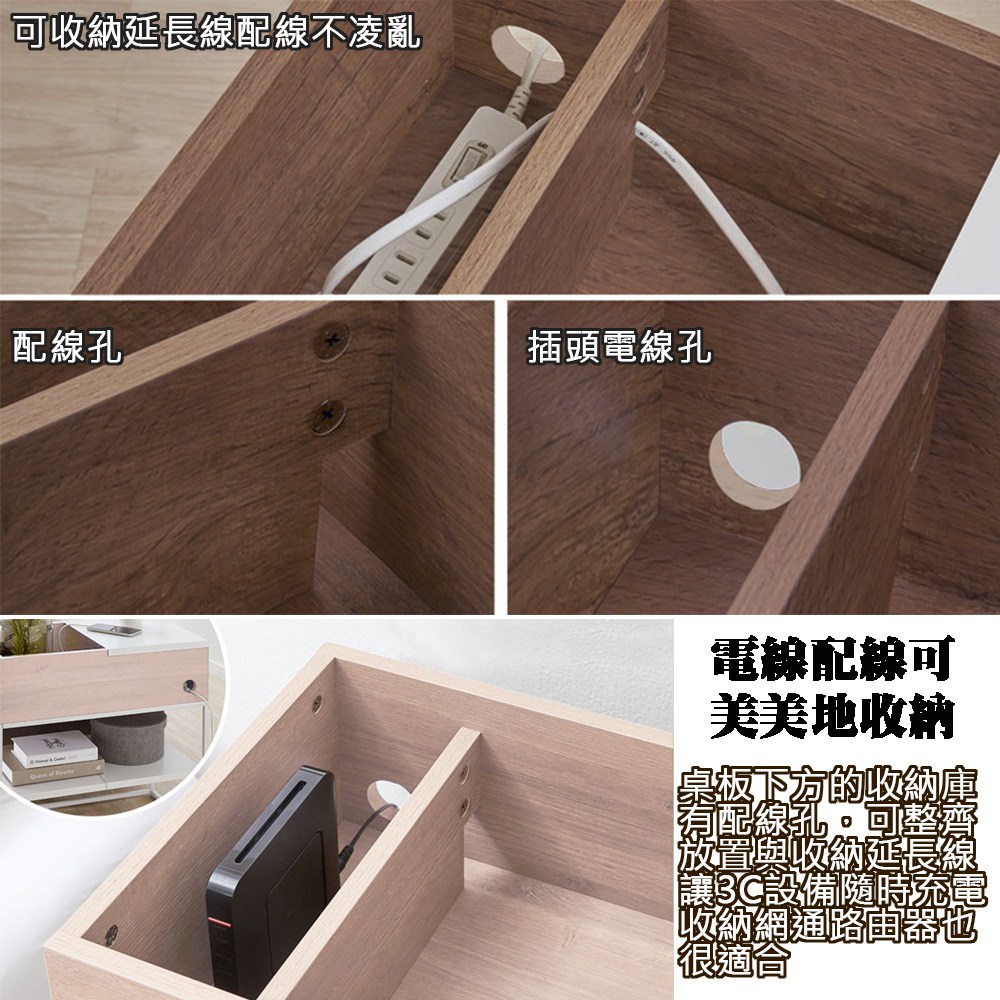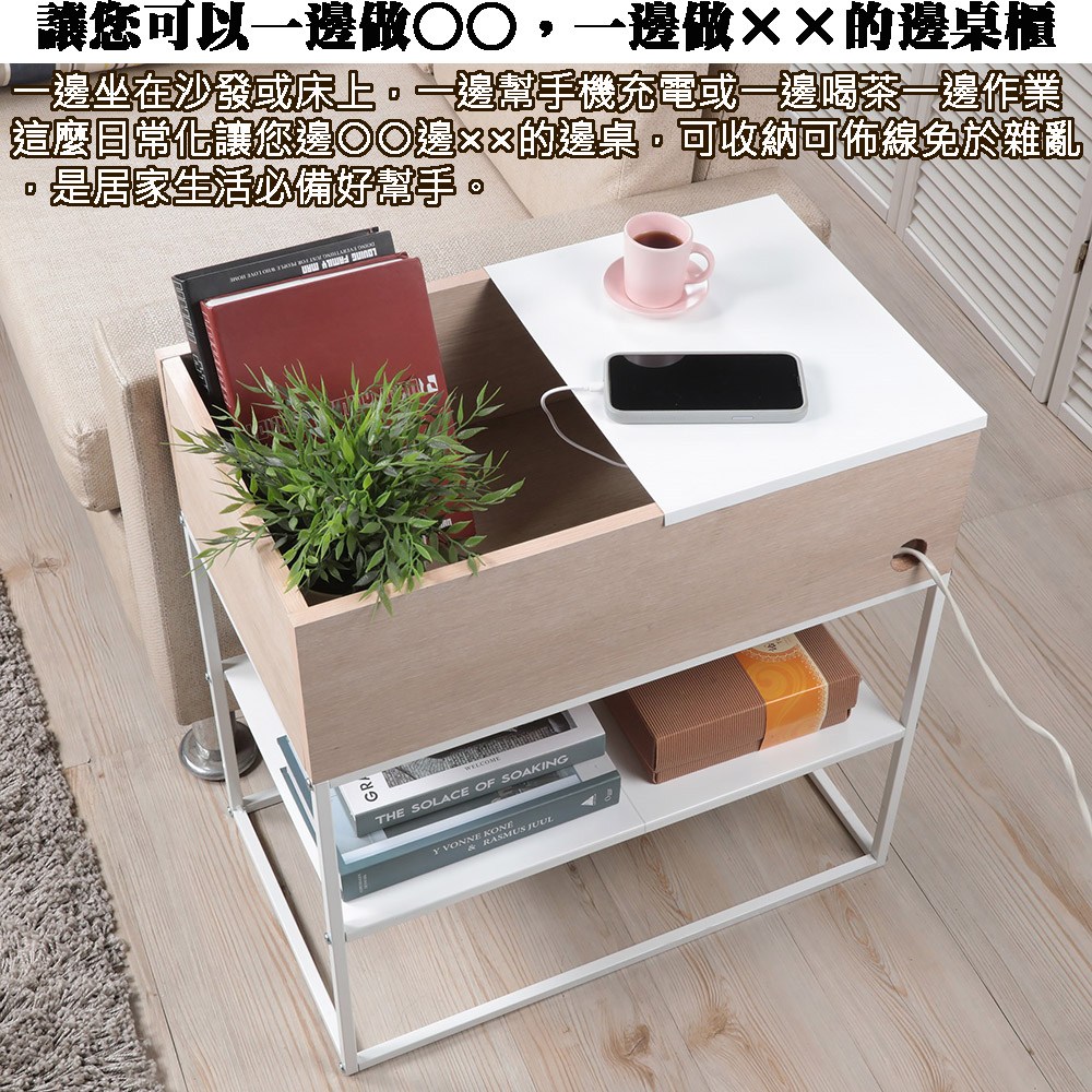 上方的收納庫與內部的隔板設計有可讓插頭與電線穿過的電線孔,方便您使用延長線或收納網通路由器設備,您的空間不會因為充斥電線而凌亂。使用者可以一邊坐在沙發或床上一邊幫手機充電;或一邊喝茶一邊作業,這麼日常化讓您能邊○○邊××的邊桌,還可收納可佈線免於雜亂,是居家生活必備好幫手。