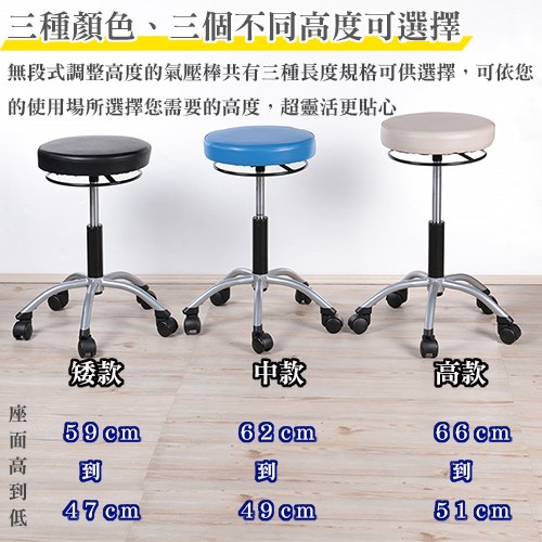 依個人身高與使用習慣以及使用目的,共有 高、中、矮三種高度不同的款式規格可以選擇,宛如量身訂做,無論美容院或高科技廠的生產線適合的矮款或是適合吧檯桌使用的高款,小孩與成人皆可使用,台灣生產安全可靠!