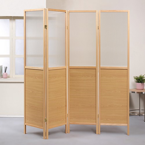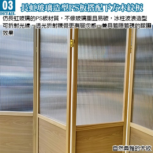 屏風面的上部是採類似長虹玻璃的PS板,視覺效果與長虹玻璃相似卻沒有玻璃的笨重感也不怕破碎,可遮蔽、能透光的透明長虹PS板保有玻璃的透光性,具備簡單冰柱波浪造型在透光下能折射光線,讓視覺有層次感,兼顧視覺隱蔽性與光線的穿透性,若隱若現的朦朧效果打造自帶濾鏡的居家空間,整體散發現代簡約的設計感。屏風面的下部則是使用具有天然木紋的木板,天然典雅質感佳。