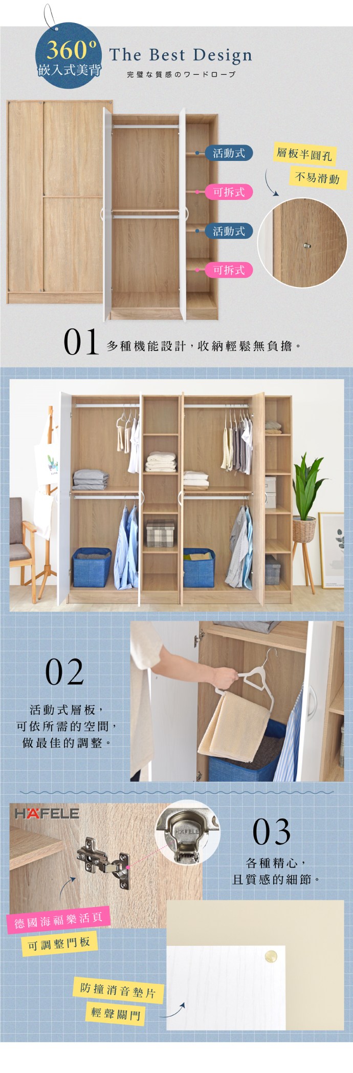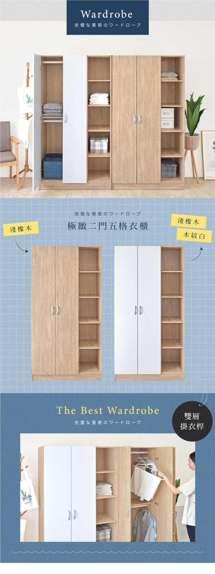 《HOPMA》德國海福樂鉸鏈 嵌入式美背極緻二門五格衣櫃 台灣製造 衣櫥 收納櫃 衣物收納櫃-淺橡(漂流)木