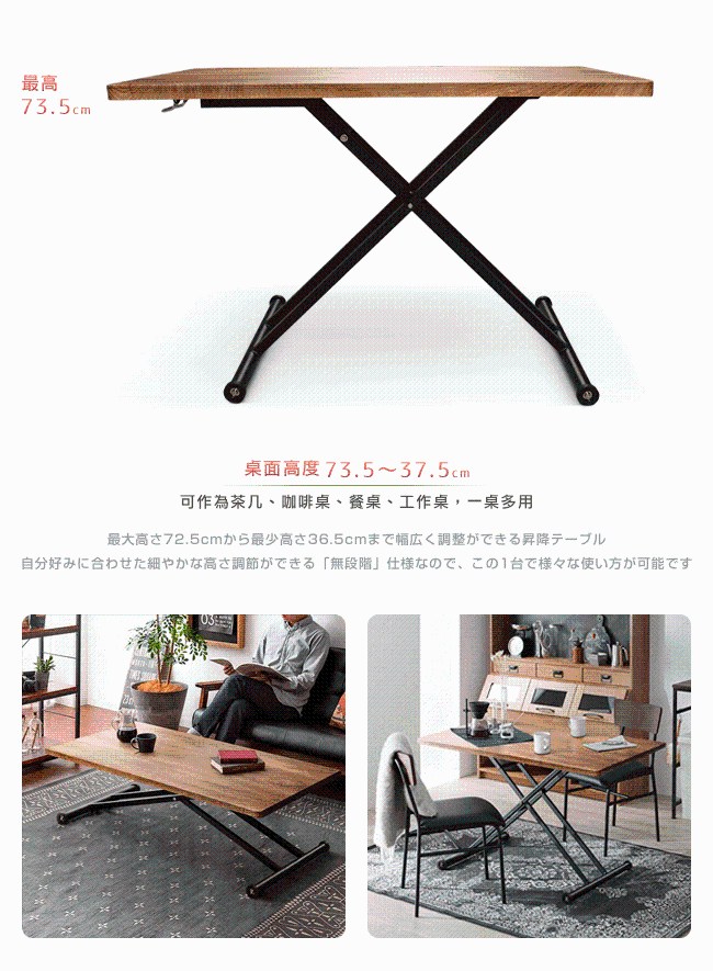 空間雖然有限,卻框不住創意。【C'est Chic】法桑琪工業風昇降機能桌-橡木年輪紋,台灣製造,日本同步銷售。讓茶几、餐桌、書桌合而為一。平常在茶几上擺放冷飲、零食,愜意追劇看電影。讀書或寫報告、使用筆記型電腦時,調整桌面高度成為工作桌,提升專注度與效率。三五好友要聚餐的話,移動到適合的空間,在餐桌上享受餐點。