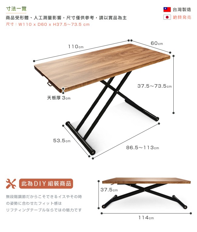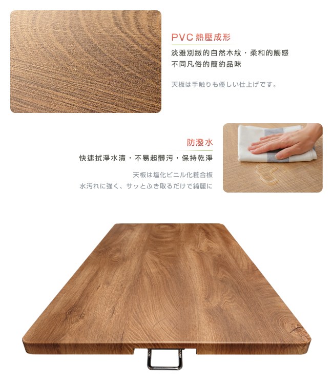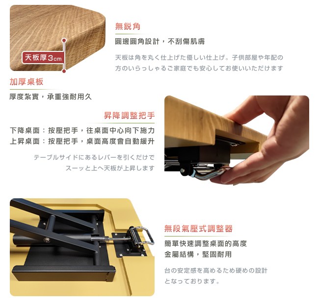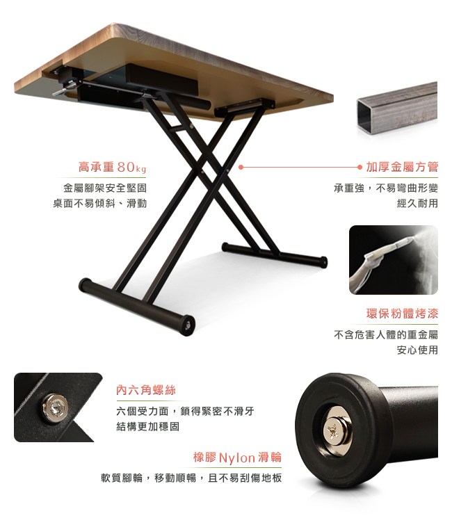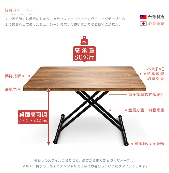 桌面高度可調整 37.5~73.5cm,作為咖啡桌、用餐桌、工作桌,一桌多用,不佔空間,帶給居家寬敞的感受。加厚桌板的厚度 3cm,高承重 80kg,紮實的天板,堅固耐用。無鋭角桌面,使用時不刮傷肌膚。橡木年輪紋的 PVC,採用熱壓成形的工藝,呈現淡雅別緻的自然木紋,柔和的觸感,不同凡俗的簡約品味,且防潑水、易清潔。無段氣壓式調整器,簡單快速調整桌面的高度。加厚金屬方管,承重強,不易彎曲形變。環保粉體烤漆,不含危害人體的重金屬,安心使用。橡膠 Nylon 滑輪,軟質腳輪,移動順暢,且不易刮傷地板。