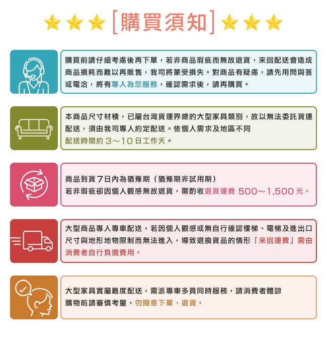 ※ 大型商品專人專車配送,若因個人觀感或無自行確認樓梯、電梯及進出口尺寸,與地形地物限制而無法進入,導致退換貨品情形「來回運費」需由消費者自行負擔費用。
