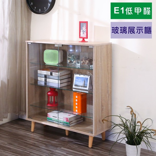 BuyJM 低甲醛寬80cm四層強化玻璃實木腳展示櫃集成木色