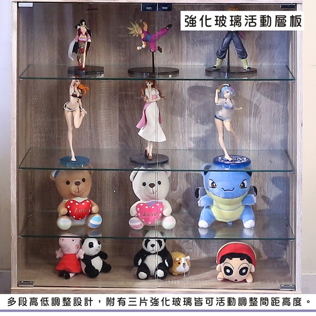 讓公仔們有個家吧!放到展示櫃裡擺放觀賞,朋友來時可以一同分享收藏,同時也可以裝飾家中的角落,全高83cm讓您完美呈現收藏品,3片強化玻璃活動層版可自由調整讓擺放不受限,按壓式玻璃門採用5mm強化玻璃,既安全又美觀,還不用擔心灰塵髒汙附著。這款安裝LED燈,夜晚燈光投射展品上,更顯光彩奪目。讓小家庭可以輕鬆收納又不佔空間,此外整體板材使用低甲醛E1健康板材,讓您用的安心。不只可以放玩具公仔模型也可以當書櫃用或放小朋友的娃娃,如此多功能的櫃子,是家中不可或缺的好物。