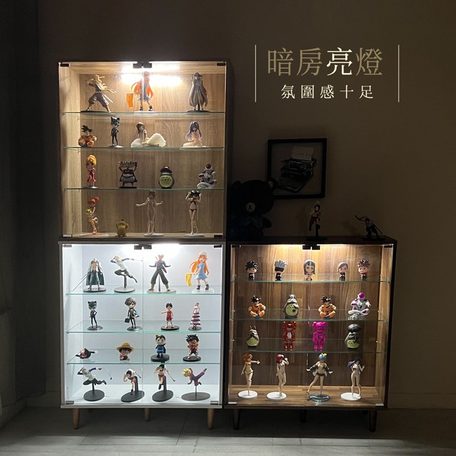 讓公仔們有個家吧!放到展示櫃裡擺放觀賞,朋友來時可以一同分享收藏,同時也可以裝飾家中的角落,全高96cm讓您完美呈現收藏品,3片強化玻璃活動層版可自由調整讓擺放不受限,按壓式玻璃門採用5mm強化玻璃,既安全又美觀,還不用擔心灰塵髒汙附著。這款安裝LED燈,夜晚燈光投射展品上,更顯光彩奪目。讓小家庭可以輕鬆收納又不佔空間,此外整體板材使用低甲醛E1健康板材,讓您用的安心。不只可以放玩具公仔模型也可以當書櫃用或放小朋友的娃娃,如此多功能的櫃子,是家中不可或缺的好物。