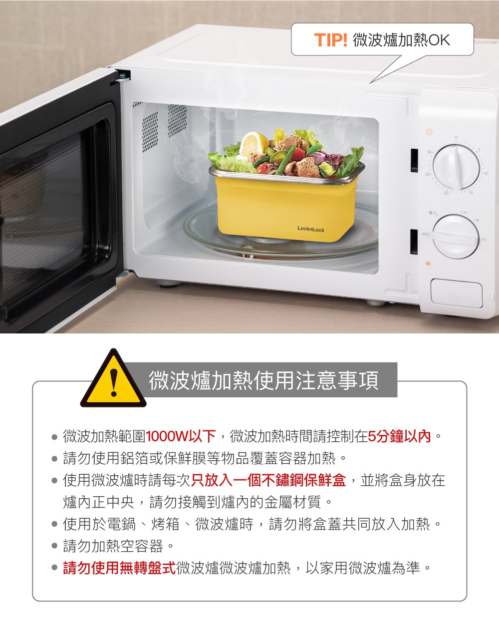 1.使用於電鍋、烤箱、微波爐時,請勿將盒蓋共同放入加熱。