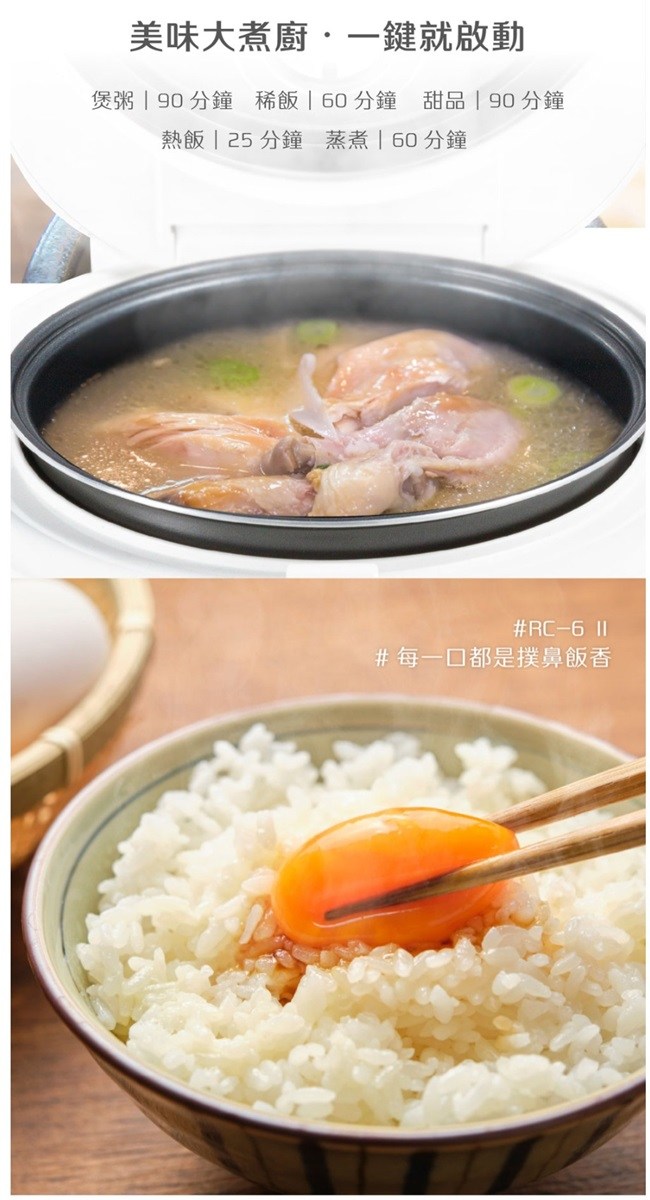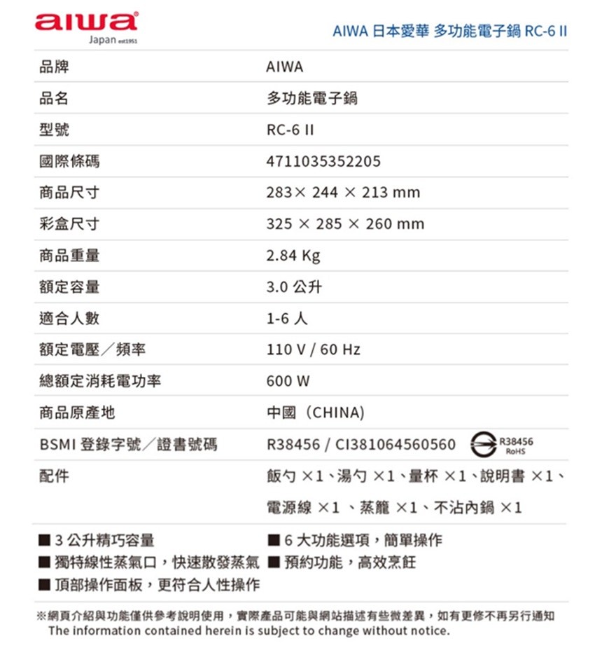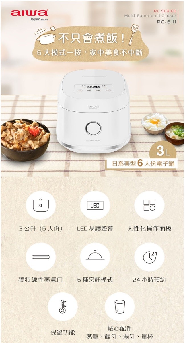 AIWA 愛華 3L 微電腦多功能電子鍋 RC-6 Ⅱ (煮飯/粥/稀飯/蒸煮/熱飯/甜品)