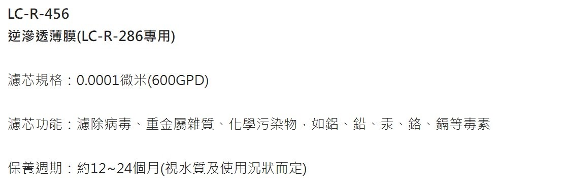 龍泉 LC-R-456 逆滲透薄膜600GPD ( 淨水器 LC-R-286 專用濾心
