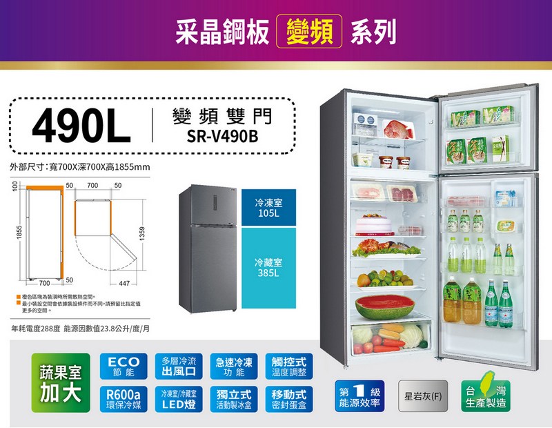 SANLUX台灣三洋490公升一級變頻雙門電冰箱 SR-V490B~含拆箱定位+舊機回收