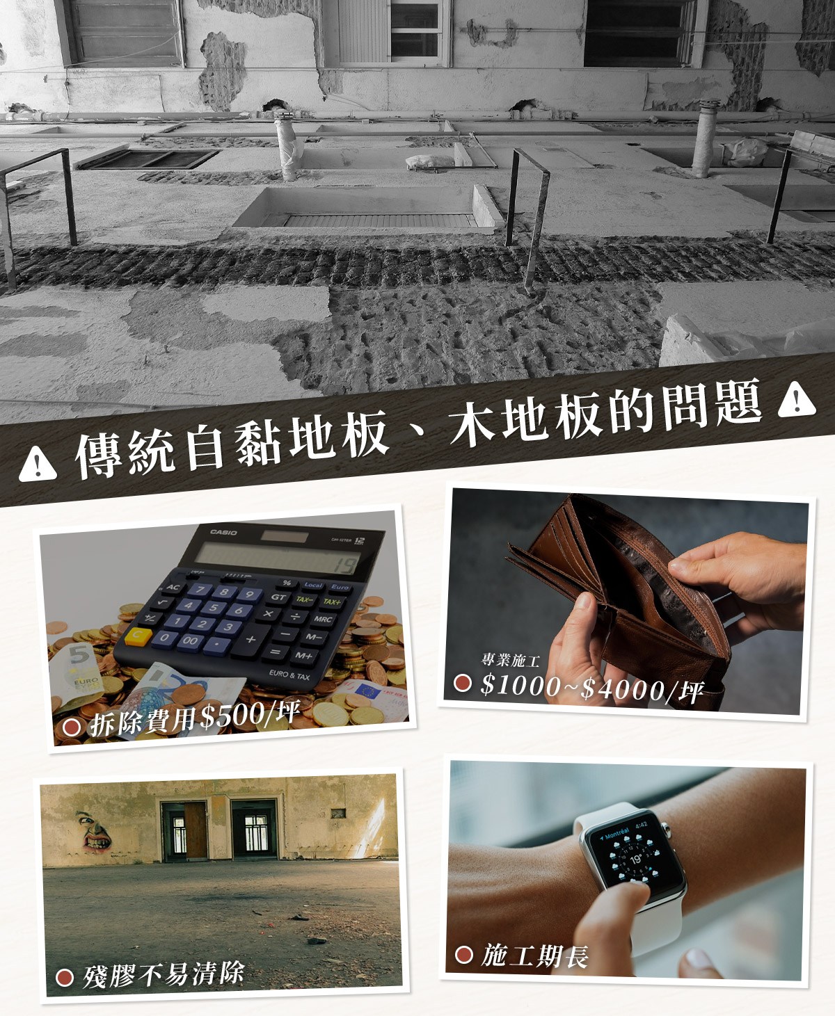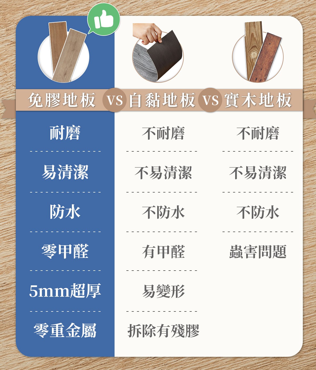 | 商品特色 | 韓國製免膠科技地板地磚 通過台灣、韓國、歐洲多項檢測合格 只需鋪上免膠免黏不留殘膠 因100%新料材質,熱脹冷縮相對穩定 通常是遇到極端的天氣變化ex:高溫後寒流 會有些微熱脹冷縮的問題約1~3mm 是否預留伸縮縫的部份就看各自需求 5mm防刮耐磨係數23、厚實降噪ICC值46,防水抗潮 使用年限長裝修地板方案首選 水泥地或原來磁磚地板、木頭地板有碎裂、縫隙等 建議先以市售補土補平再施作新地板 或搜尋 『樂嫚妮 PVC塑膠地板地貼地磚底料』 |